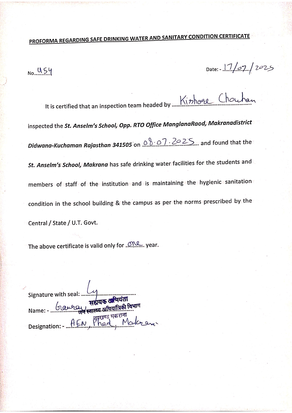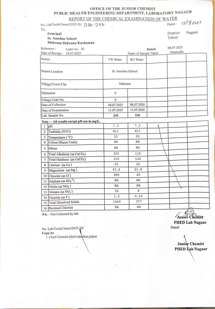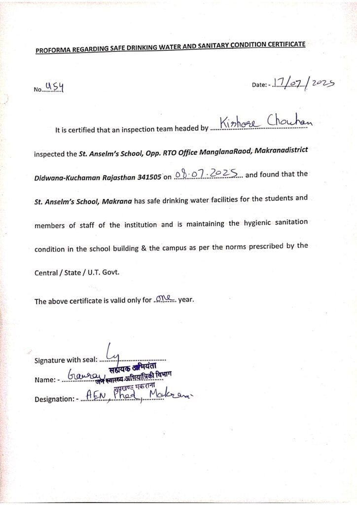 Drinking Water Certificate